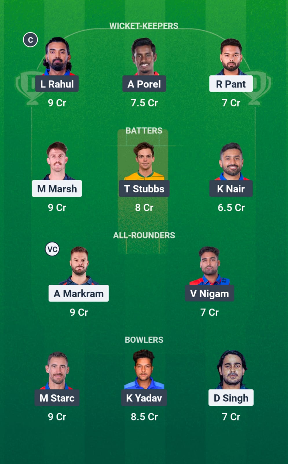 Abishek Porel, Karun Nair, KL Rahul (WK), Axar Patel (C), Tristan Stubbs, Ashutosh Sharma, Vipraj Nigam, Kuldeep Yadav, Mohit Sharma, Mitchell Starc, Mukesh Kumar