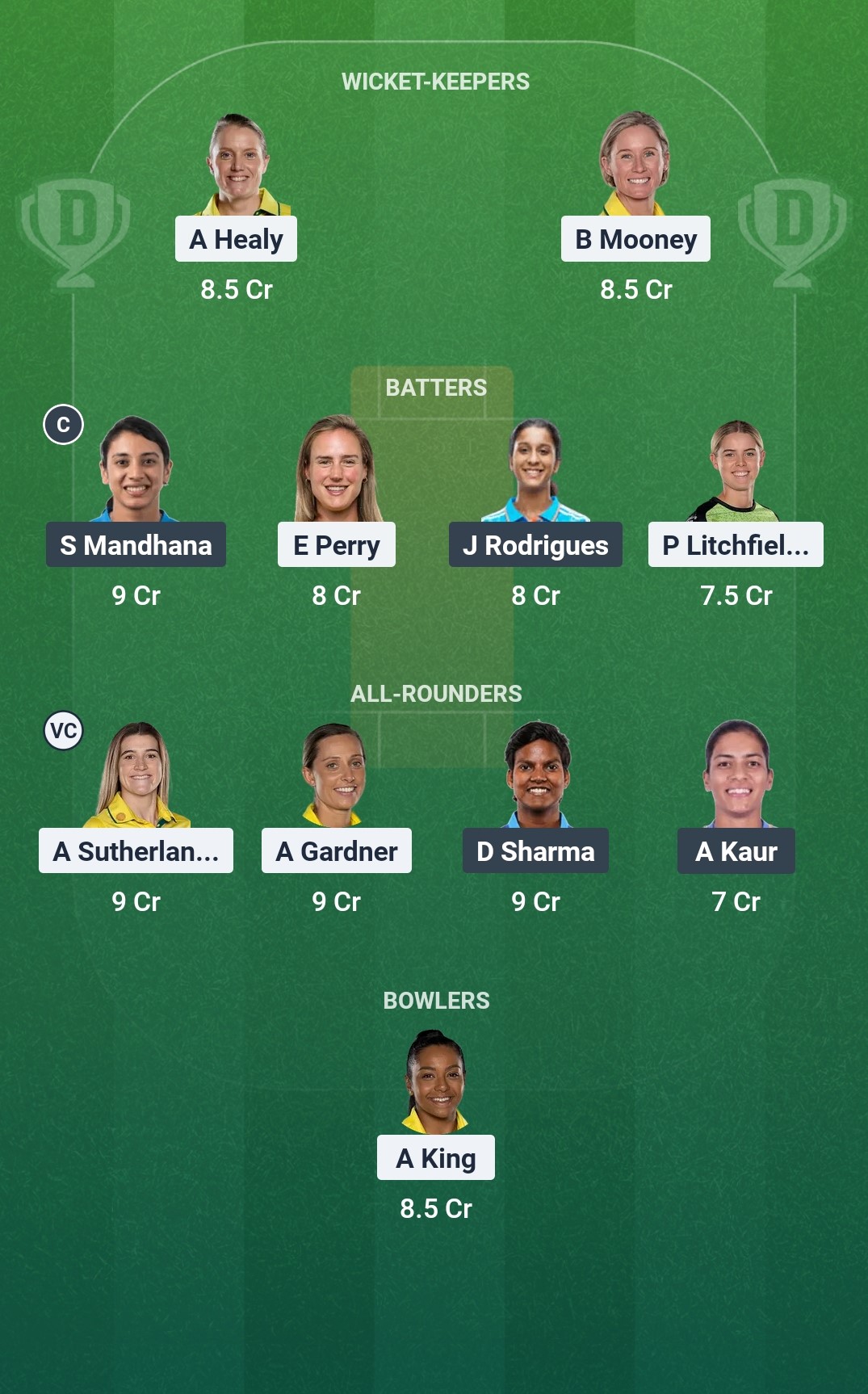The best all-rounders playing this contest are Harmanpreet Kaur, Amanjot Kaur, Sneh Rana, Deepti Sharma, Ashleigh Gardner, Kim Garth, Heather Graham, Tahila McGrath, Annabel Sutherland, and Ellyse Perry.