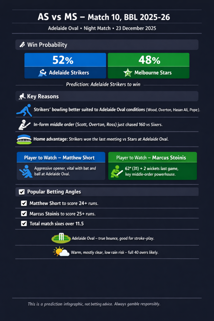 The Stars enter this clash on the back of a dominant eight‑wicket win, fuelled by a red‑hot Marcus Stoinis and a confident top order, making them a very dangerous travelling side. Adelaide Strikers, however, have home advantage at a ground their bowling unit understands well, plus a middle order that just chased 160 comfortably and looks capable of absorbing pressure.