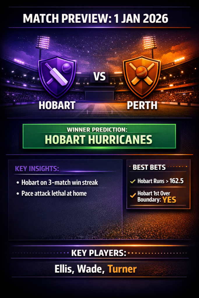 Hobart at home is a daunting prospect for any visiting side. The Hurricanes sit deservedly above the Scorchers on the table and ride a wave of confidence after three consecutive wins. Conversely, Perth looks unsettled, making the hosts clear favorites to extend their streak.