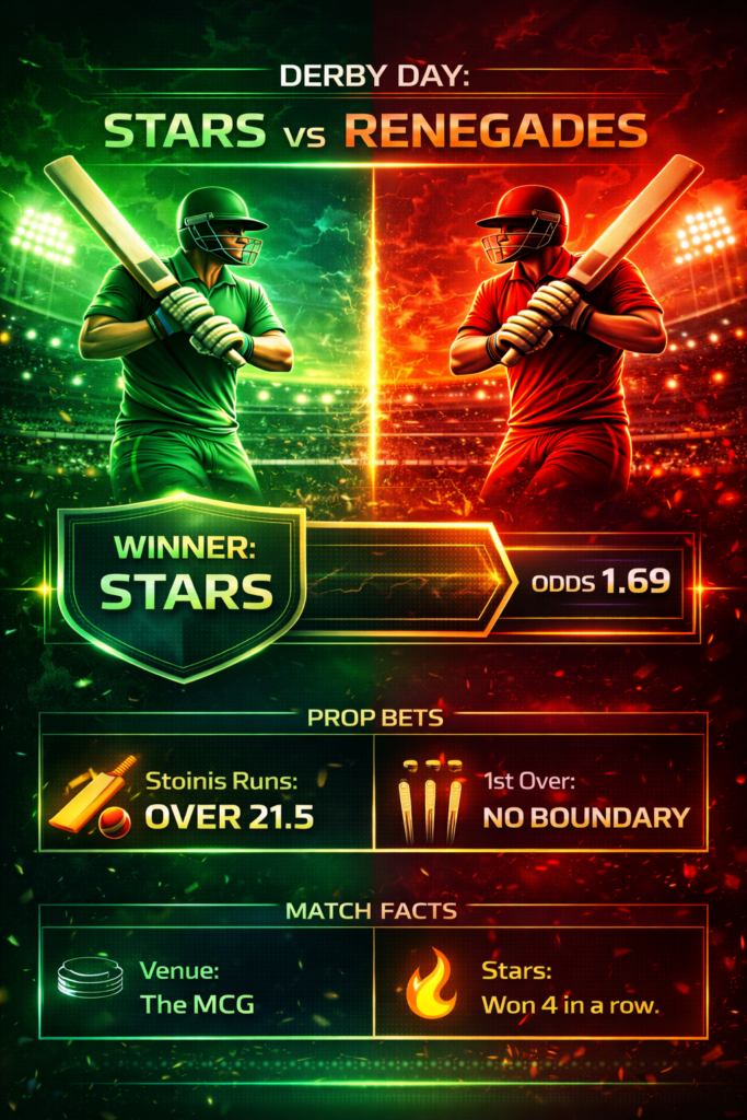 The Stars are firm favorites to take bragging rights in the Melbourne derby. With their batting firing and bowlers executing plans, adding a fifth consecutive win seems the most likely outcome against a struggling Renegades outfit.