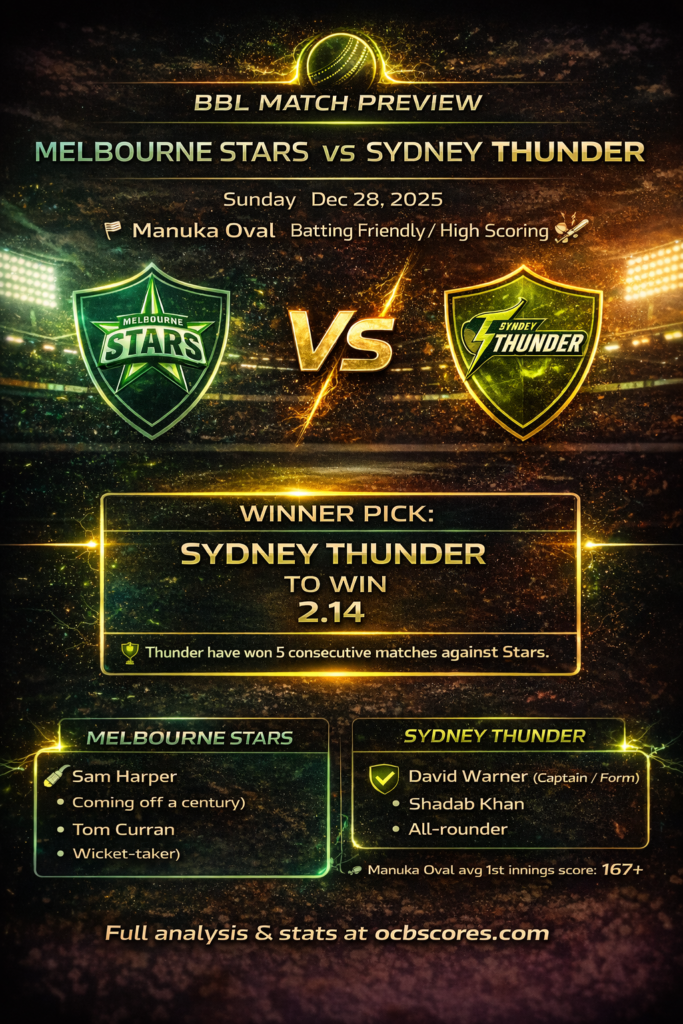 The Sydney Thunder has established complete dominance over the Melbourne Stars in recent years. The Thunder has won five consecutive matches against the Stars, a psychological edge that cannot be ignored.