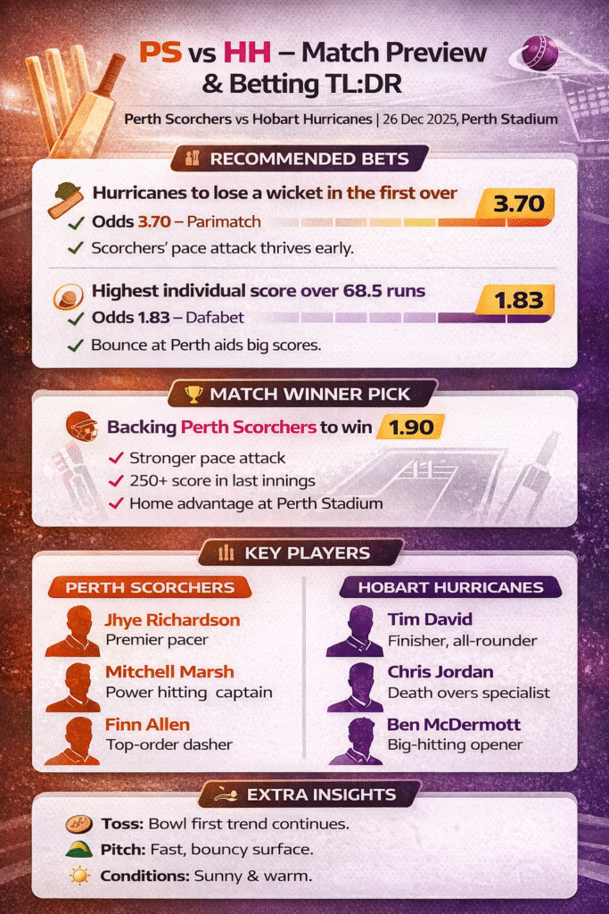Perth Scorchers’ pace attack is known for early breakthroughs, and conditions at Perth Stadium will only aid their cause. Jhye Richardson’s ability to strike with the new ball could trouble the Hurricanes’ fragile top order. With Hobart losing a wicket off the first ball in their last match, this high-risk, high-reward bet might just pay off handsomely.