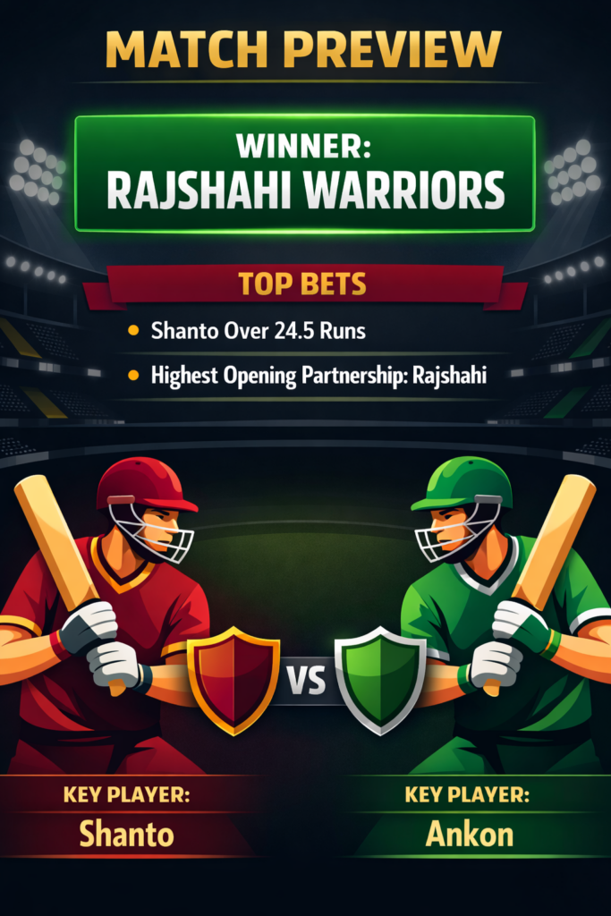 Rajshahi boasts a solid opening duo in Sahibzada Farhan and Tanzid Hasan, both of whom have the experience and pedigree to survive the new ball. In contrast, Noakhali Express is likely to deploy youngsters Maaz Sadaqat and Habibur Rahman at the top. While talented, they are unproven and face a steep challenge against Rajshahi’s quality seam attack, making the Warriors the smart bet to win the opening stand battle.