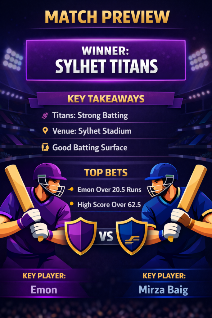 While both teams have shown flashes of inconsistency, the momentum is currently with the home side. We are backing the Sylhet Titans to take the win. Their batting lineup boasts proven match-winners, and their well-rounded bowling attack gives them a distinct edge over the Royals. Chattogram will fight hard, but Sylhet's depth should see them through.