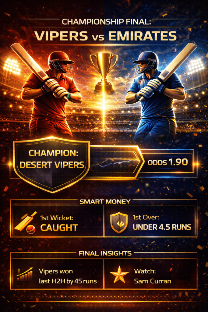 Both teams deserve their spot in the final, having been the top two sides all season. However, momentum is key. The Desert Vipers not only topped the table but also psychologically scarred MI Emirates with a convincing 45-run win in the first qualifier. With a firing top order and a bowling attack peaking at the right time, the Vipers look poised to lift the trophy.