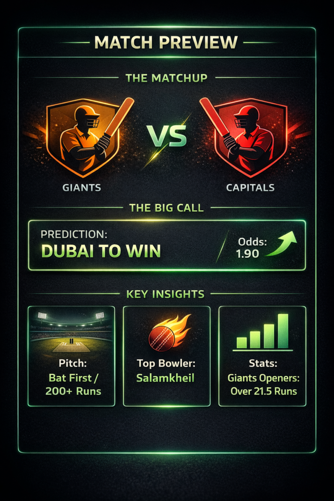 Both sides have shown flashes of brilliance mixed with inconsistency, making this a tricky market. However, the Dubai Capitals hold the edge due to the superior balance of their bowling attack, which is better equipped to exploit the Giants' weakness against spin.