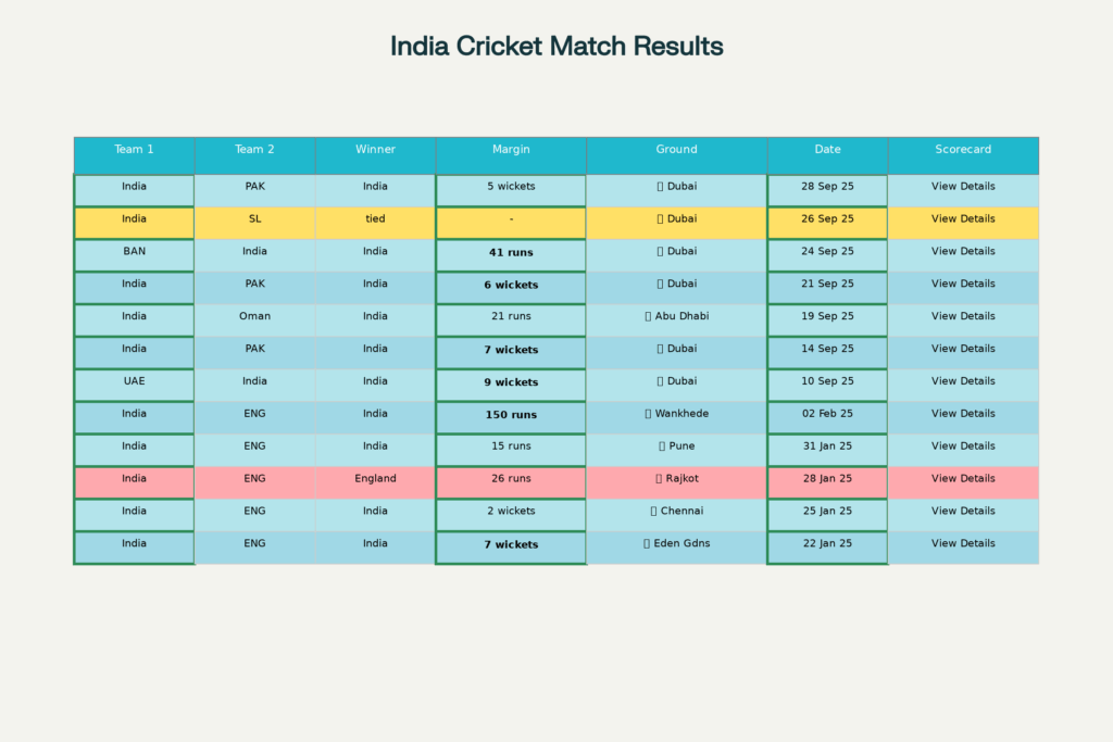 Table: India T20 Results in 2025. One loss (in red) and one tie (in yellow). Everything else is a victory.