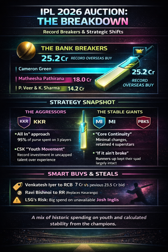 The IPL 2026 mini-auction concluded in Abu Dhabi on December 16, 2025, with all ten franchises finalizing their 25-player rosters. The event witnessed record-breaking deals, strategic acquisitions, and surprising investment patterns that have reshaped team dynamics ahead of the upcoming season.