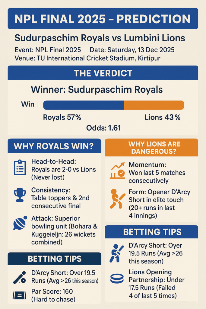 The Sudurpaschim Royals take on the Lumbini Lions on Saturday at the Tribhuvan University International Cricket Stadium in Kirtipur, and the winner of this match will lift the coveted trophy.
