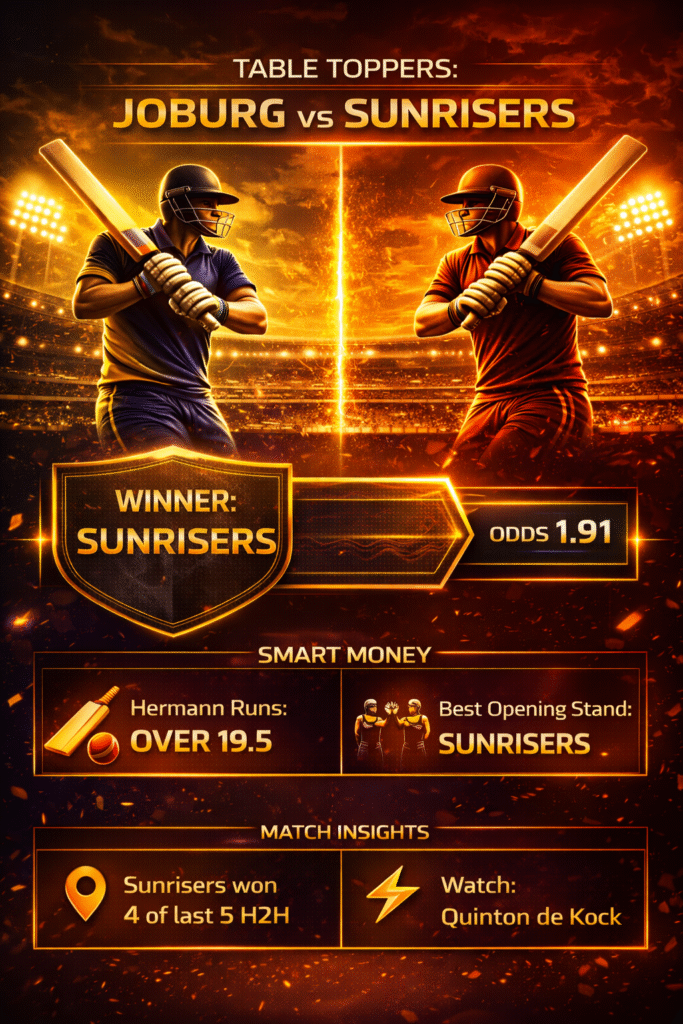 This is a clash of titans—the league's best bowling unit (Joburg) vs the league's most explosive batting unit (Sunrisers). While Joburg has momentum, we believe the Sunrisers' superior batting depth gives them the edge on a high-scoring Wanderers deck.